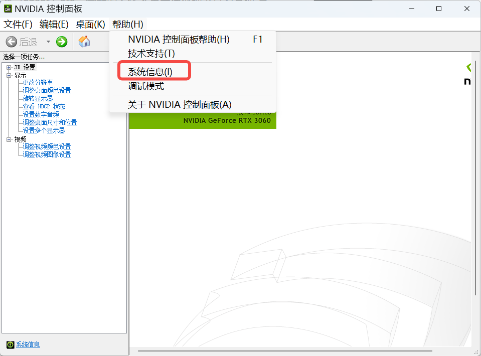 NVIDIA控制面板,选择菜单:帮助->系统信息。