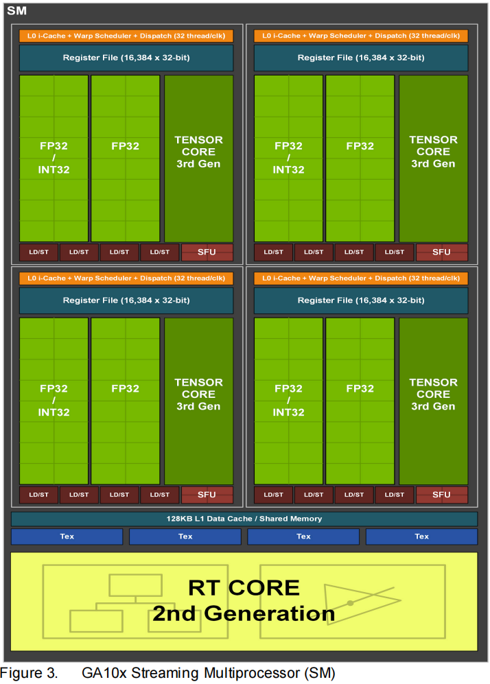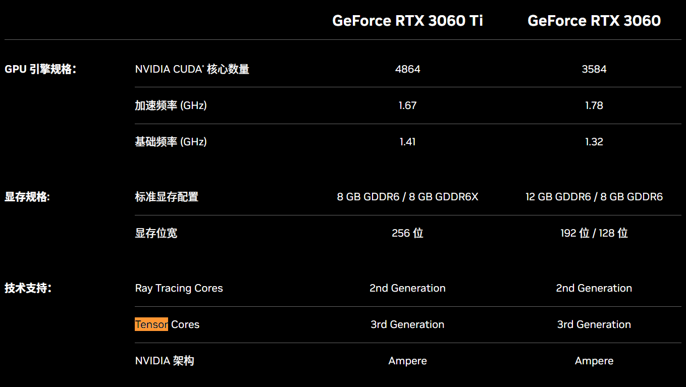 RTX 3060的GPU架构是Ampere,按照这个参数说明,一个SM包含128(164 FP32 + 164 FP32/INT32)个CUDA Core+ 4个Tensor Core+ 1个RT Core。RTX 3060有3584个CUDA Core,所以有3584/128=28个SM,Tensor Core的数量 = 28*4 = 112,RT Core的数量 = 28。