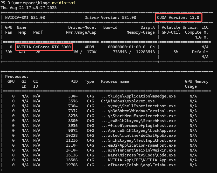 nvidia-smi不能查看CUDA的核心数,但是可以查看CUDA的版本。- nvidia-smi(